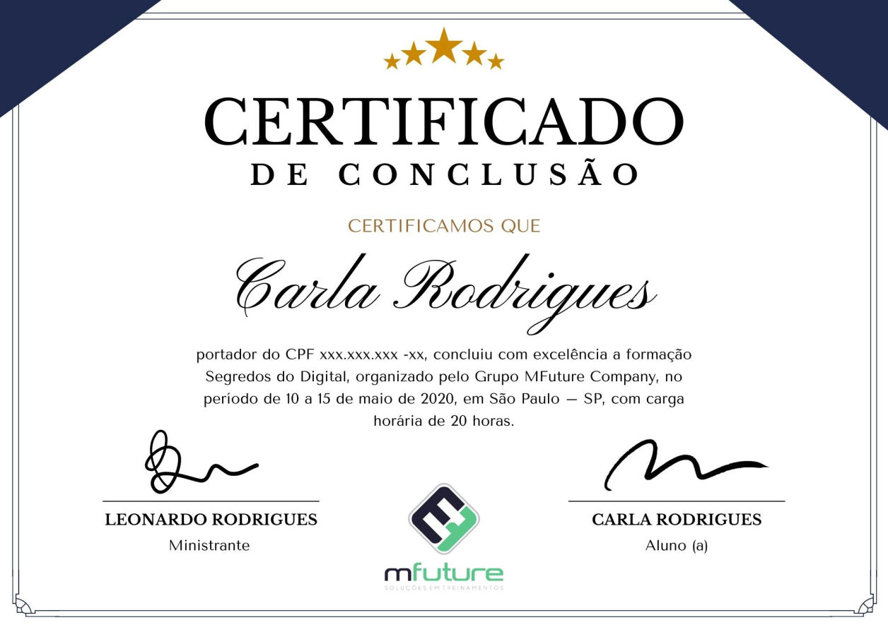 Claro. Você receberá seu certificado impresso e assinado pela MFuture Company, uma empresa especializada em marketing e treinamentos, com sede em São Paulo.